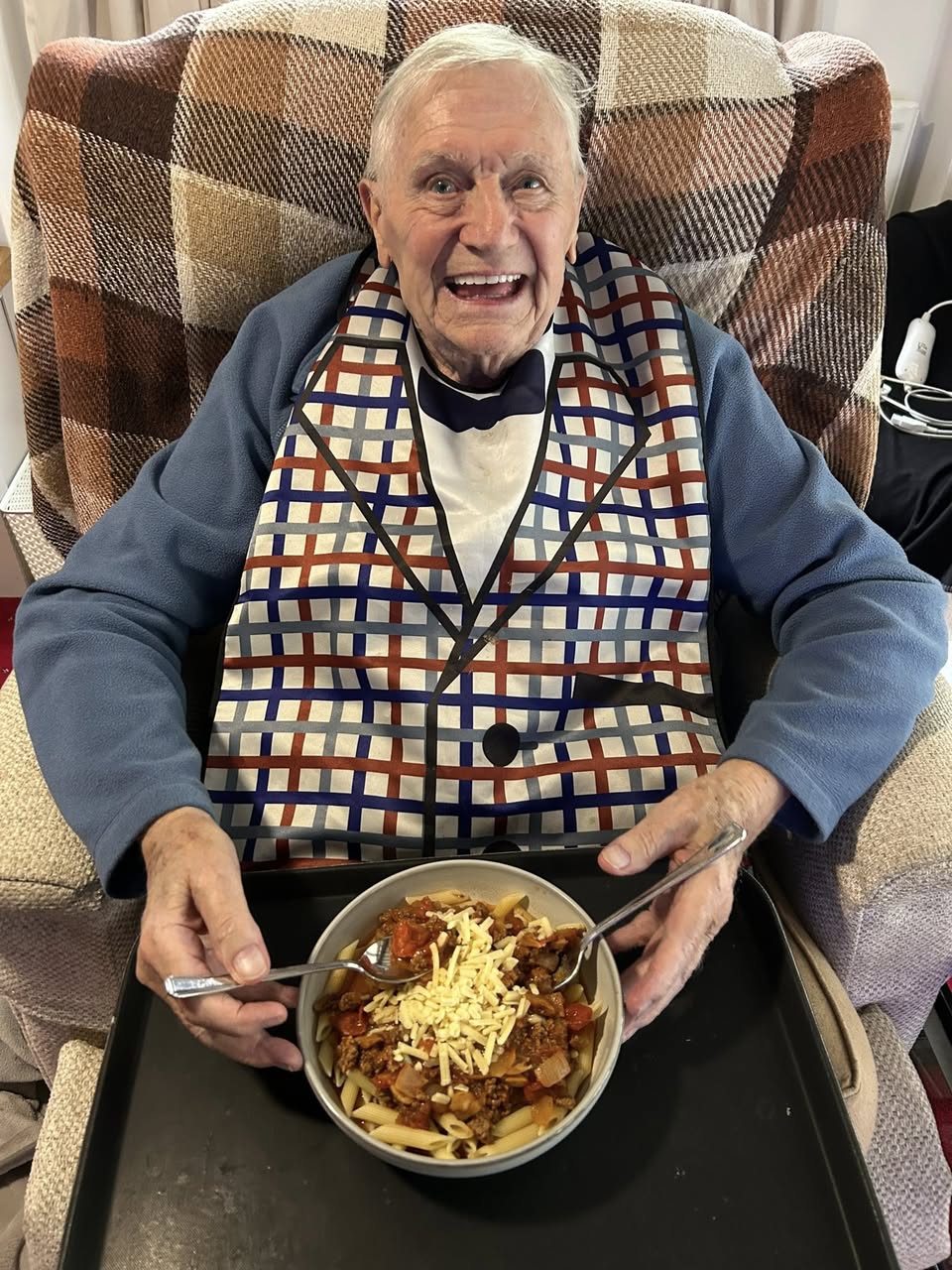 In a softly lit room, an elderly person sits wrapped in warmth โ a plaid blanket draped over the chair, a patterned bib resting gently across their chest. In their hands, a bowl of penne pasta topped with rich meat sauce and a sprinkle of cheese. Itโs not just a meal. Itโs a message: You are seen. You are cherished.