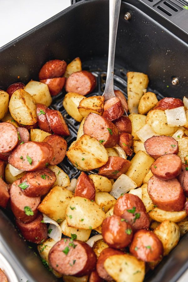 - Dump (gently) the potato and sausage mixture into the air fryer basket. Spread it out in an even layer.
