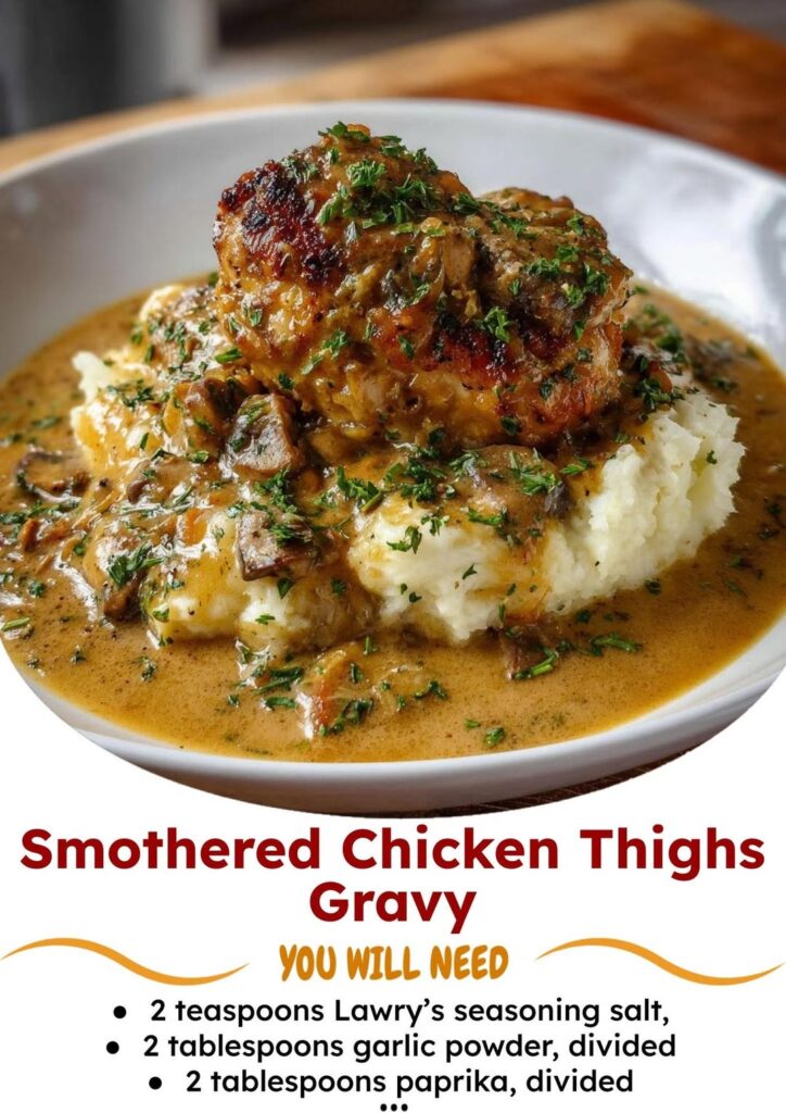Here’s a soul-warming, savory dish that’s perfect for cozy dinners 😋🍗🧅 🍗 Smothered Chicken Thighs with Gravy 📝 Ingredients 6 bone-in, skin-on chicken thighs Salt, pepper, paprika, garlic powder (for …