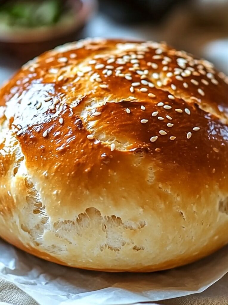 Ingredients: 3½ cups all-purpose flour 2 teaspoons instant yeast 1½ teaspoons salt 1½ cups warm water 1 tablespoon olive oil (for brushing) 2 tablespoons sesame seeds (for topping) Parchment paper