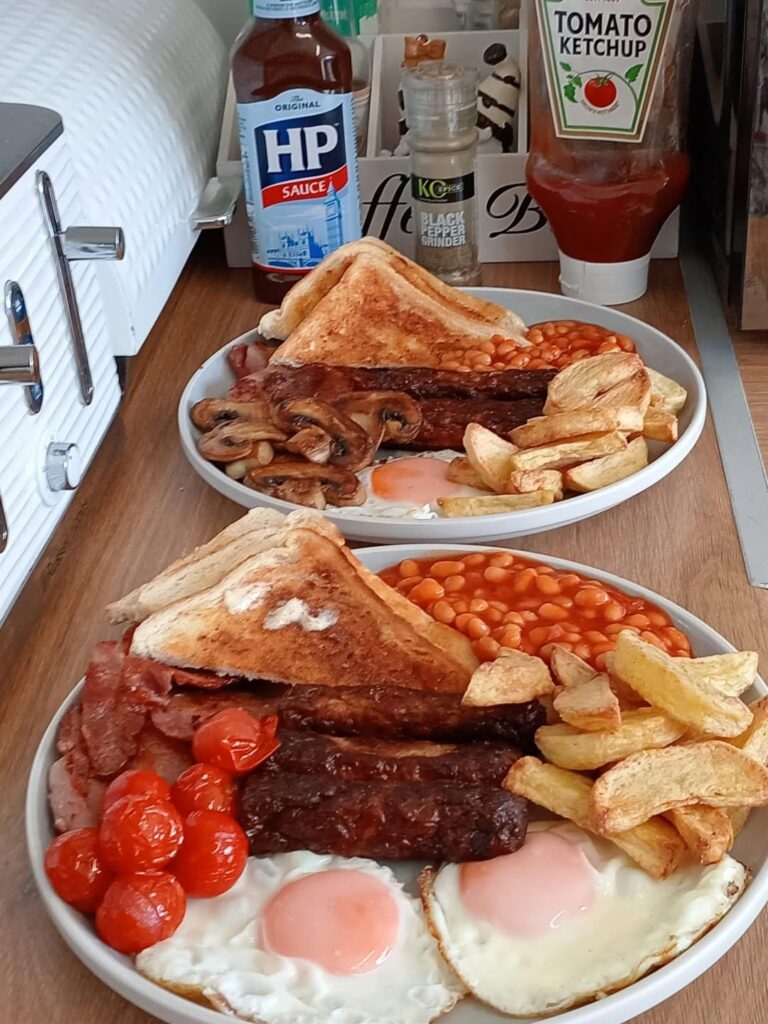 Ingredients: 2 eggs (free-range) 2 slices of nitrate-free bacon 1 beef sausage or plant-based alternative 1 handful cherry tomatoes 1 cup mushrooms (sliced) 1 medium potato (cut into chips) Olive …