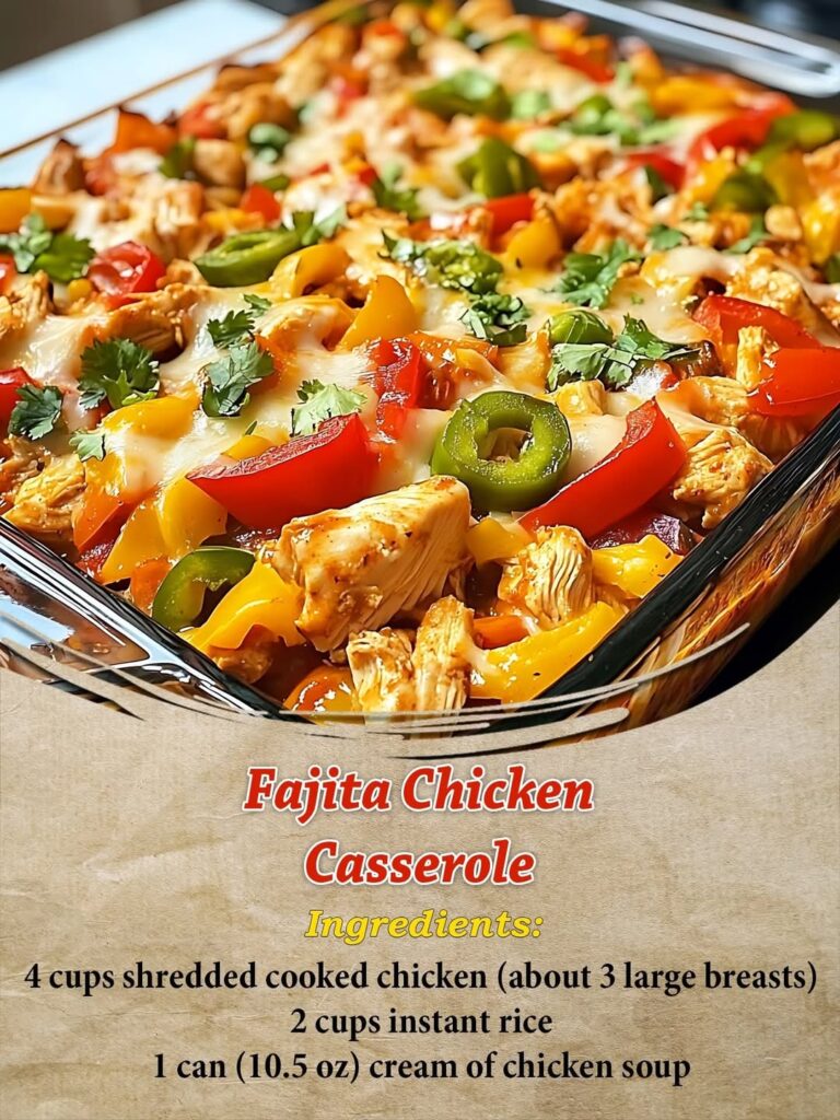 Fajita Chicken Casserole Ingredients: 4 cups shredded cooked chicken (about 3 large breasts) 2 cups instant rice 1 can (10.5 oz) cream of chicken soup 1 cup sour cream 1 …