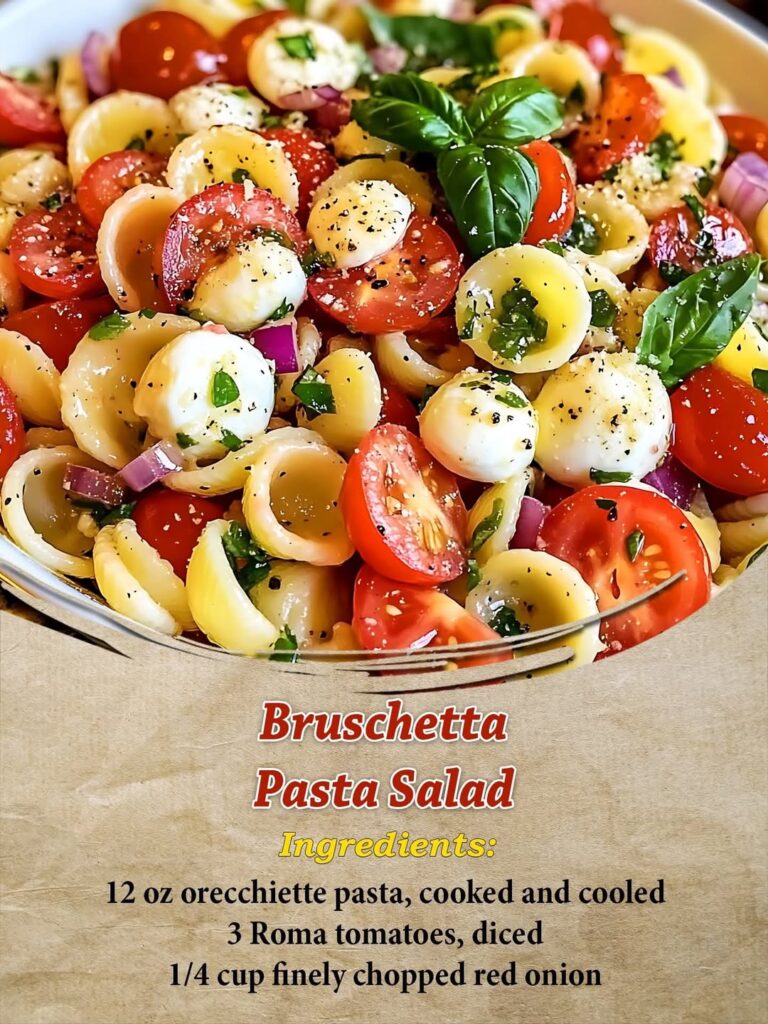 Bruschetta Pasta Salad Ingredients: 12 oz orecchiette pasta, cooked and cooled 3 Roma tomatoes, diced 1/4 cup finely chopped red onion 1/2 cup shredded Parmesan cheese 1/2 cup mozzarella pearls …