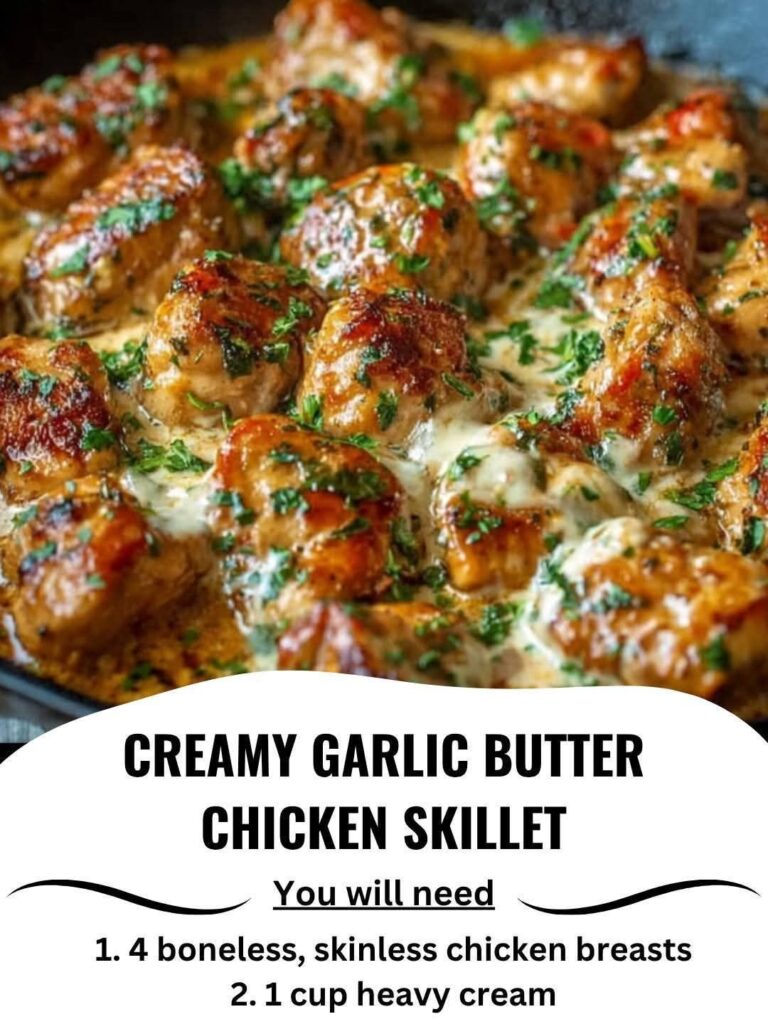 Creamy Garlic Butter Chicken Skillet Ingredients: 1. 4 boneless, skinless chicken breasts 2. 1 cup heavy cream 3. 4 cloves garlic, minced 4. 1 cup grated Parmesan cheese 5. 1 …