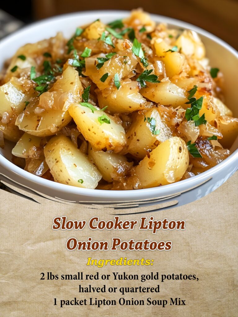 Ingredients: – 2 lbs small red or Yukon gold potatoes, halved or quartered – 1 packet Lipton Onion Soup Mix – 1/4 cup olive oil – 1/4 cup unsalted butter, …