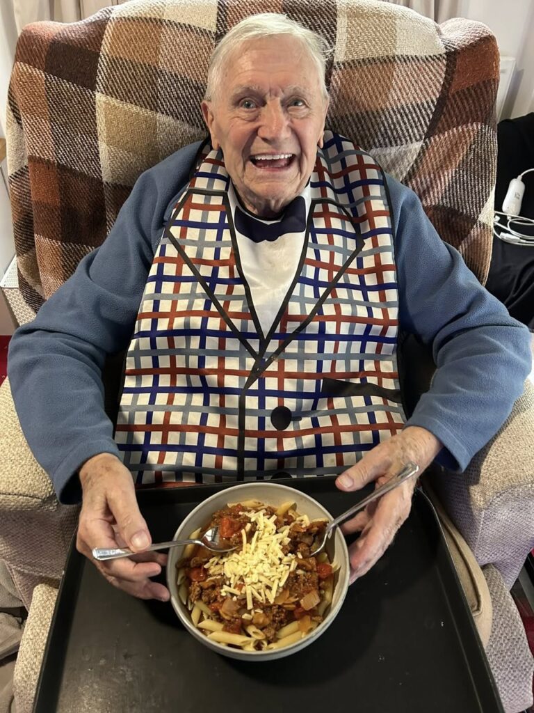 In a softly lit room, an elderly person sits wrapped in warmth β a plaid blanket draped over the chair, a patterned bib resting gently across their chest. In their …