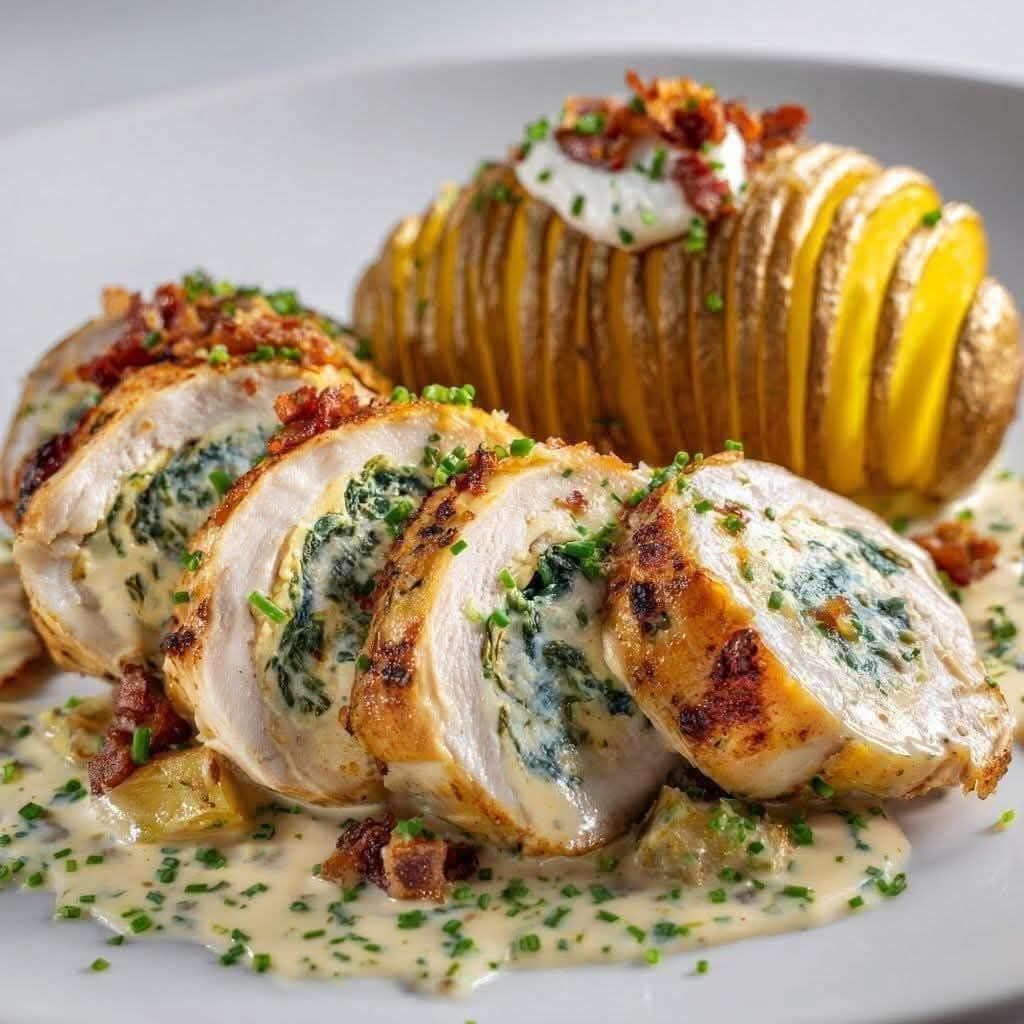 – Assemble: Spread the filling over each chicken breast, roll tightly, and secure with kitchen twine.