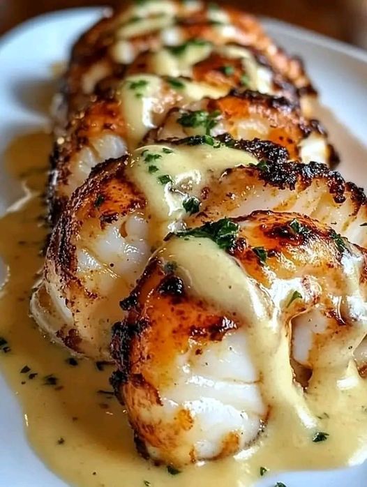 Finish and Serve: Spoon the rich garlic butter sauce over the cooked lobster tails and garnish with parsley.