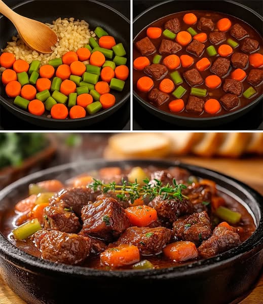 5. Cocina el estofado a fuego lento durante 1.5 a 2 horas, o hasta que la carne esté tierna. Añade las zanahorias y el apio durante los últimos 30 minutos de cocción.