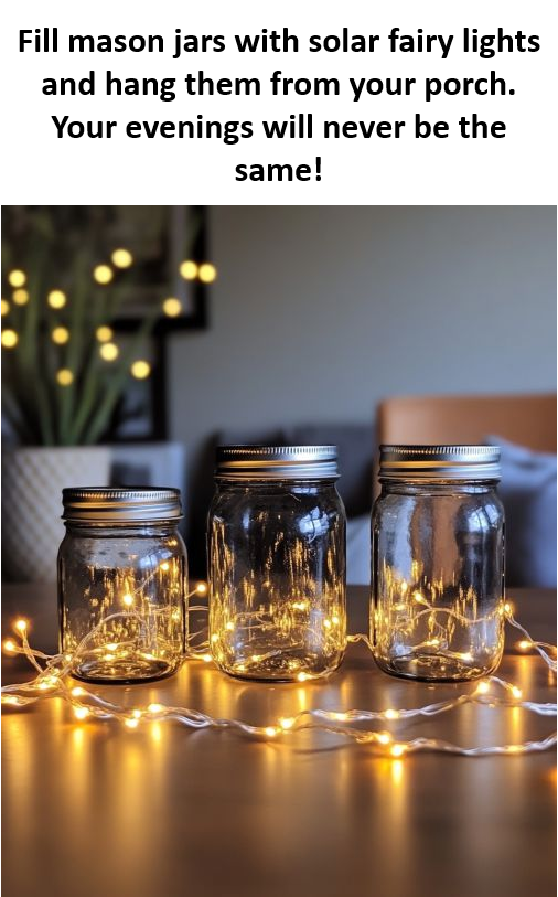 Fill mason jars with solar fairy lights and hang them from your porch. Your evenings will never be the same!