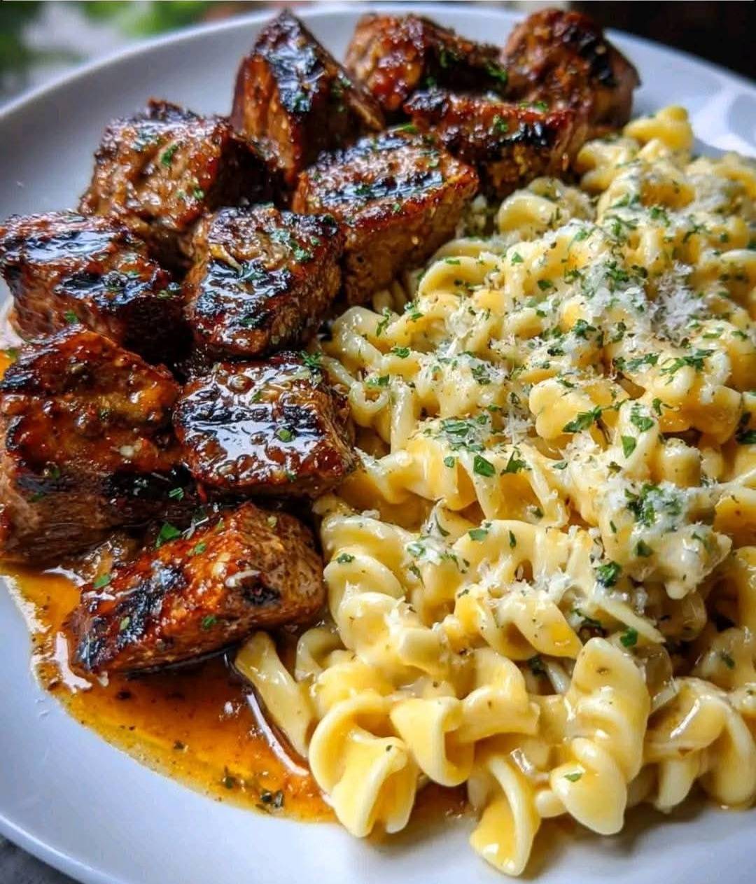 Divide the creamy Alfredo onto plates.Top with the garlic butter steak bites.