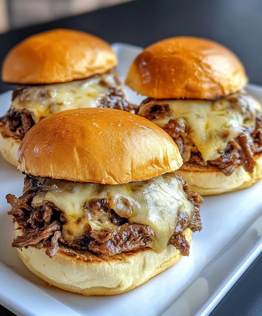 Easy Philly Cheesesteak Sliders are ready! Remove from the oven, cut into individual sandwiches and serve.