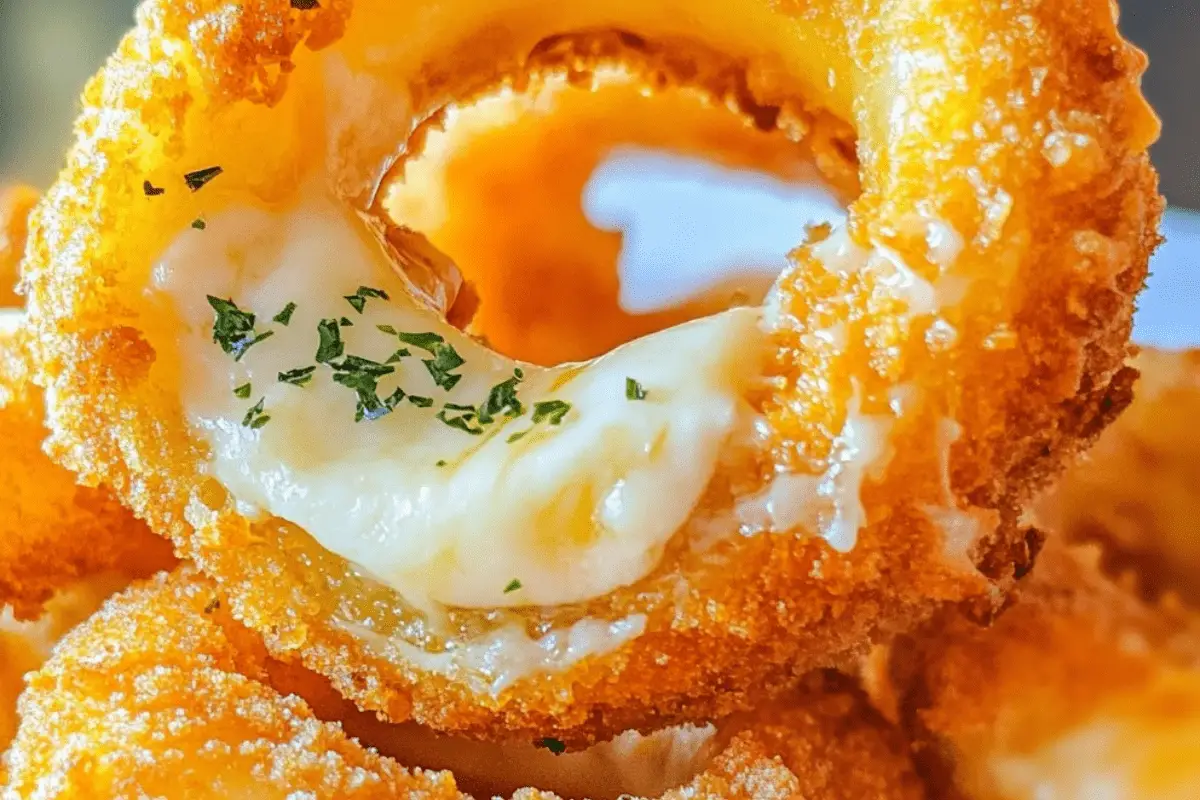 MOZZARELLA-STUFFED ONION RINGS WITH GARLIC BUTTER DIP