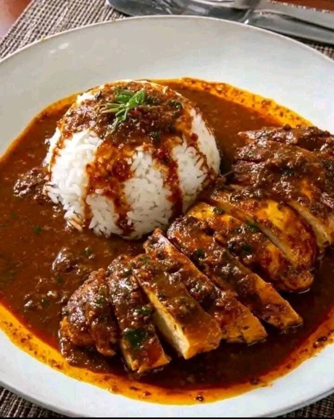 Toast the dried ingredients, cook onions, garlic, and tomatoes until soft. Blend everything together with broth, chocolate, and bread to make a deep, smooth sauce. Simmer to let the flavors marry. Pour the sauce over tender chicken slices and pair it with hot rice and a hint of green garnish.