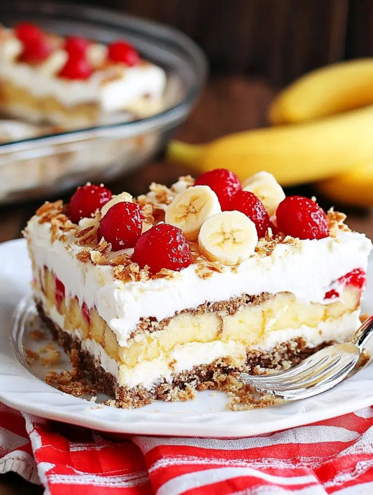 This No-Bake Banana Split Cake could be the best dessert for any time of the year with all the tastes of a timeless banana separate in a fuss free cake! Layers of creamy filling, fresh bananas, strawberries and pineapple rest on a buttery graham cracker crust and are topped with whipped topping, nuts and a drizzle of chocolate sauce. It’s an effortless, no-bake dessert sure to make a splash at family and friends!
