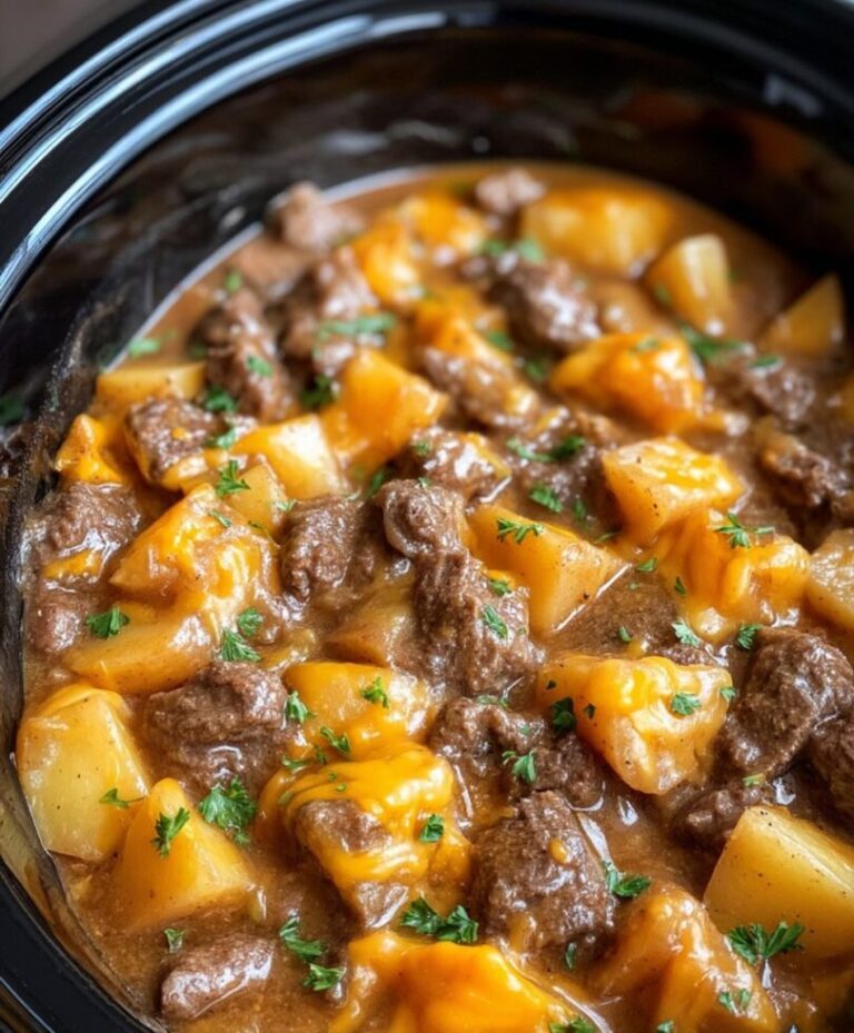 The best thing about this recipe is that everything cooks together in the slow cooker, merging into a wonderfully cozy and satisfying meal. Just brown the beef, chop some onions and garlic, layer in sliced potatoes, and let it simmer away. In just 6-7 hours, dinner is ready!
