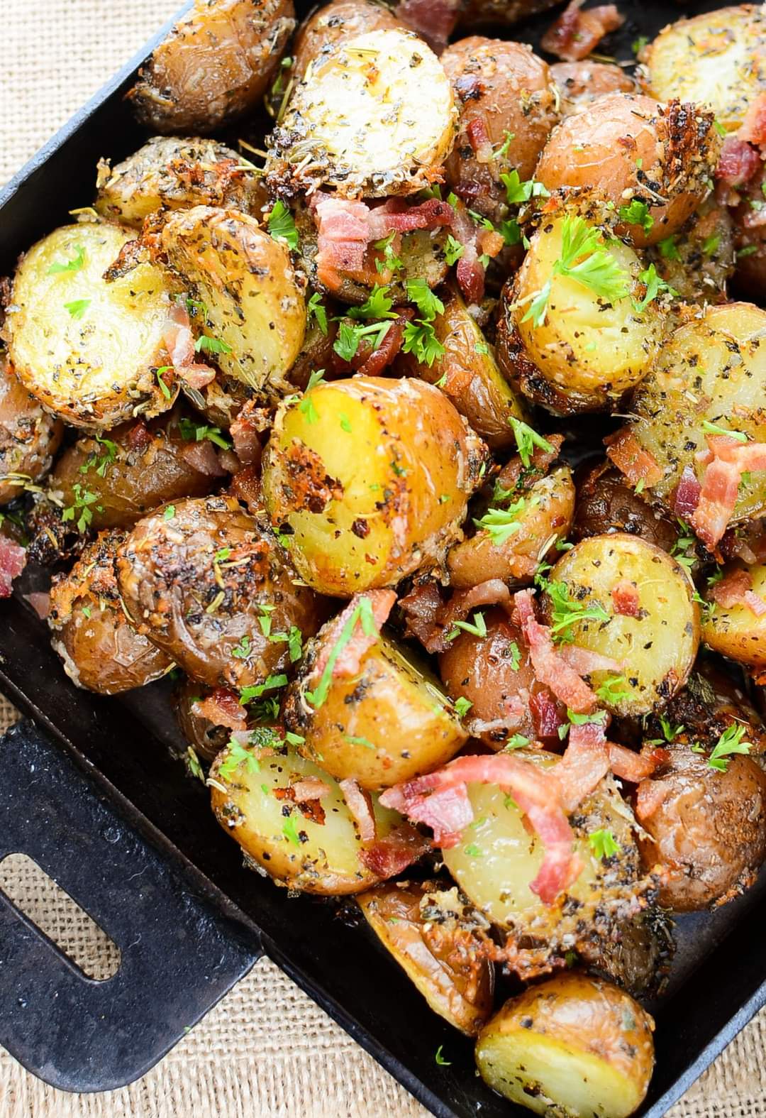 These Parmesan Crusted Roasted Potatoes are not only incredibly easy to make, they’re baked & taste is phenomenal with the addition of thick cut bacon!
