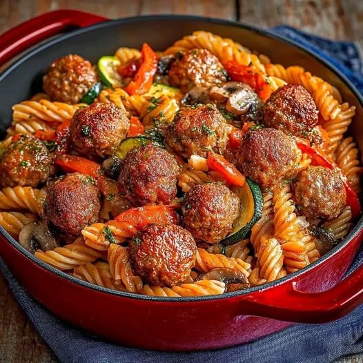 This pasta dish combines tender, flavorful meatballs with fresh vegetables and a rich, savory sauce for the perfect comforting meal. The combination of herbs, garlic, and juicy meat makes these gourmet meatballs a star, while the vegetable-studded sauce adds color, nutrition, and balance. Perfect for a hearty family dinner or an impressive yet easy weekend meal.