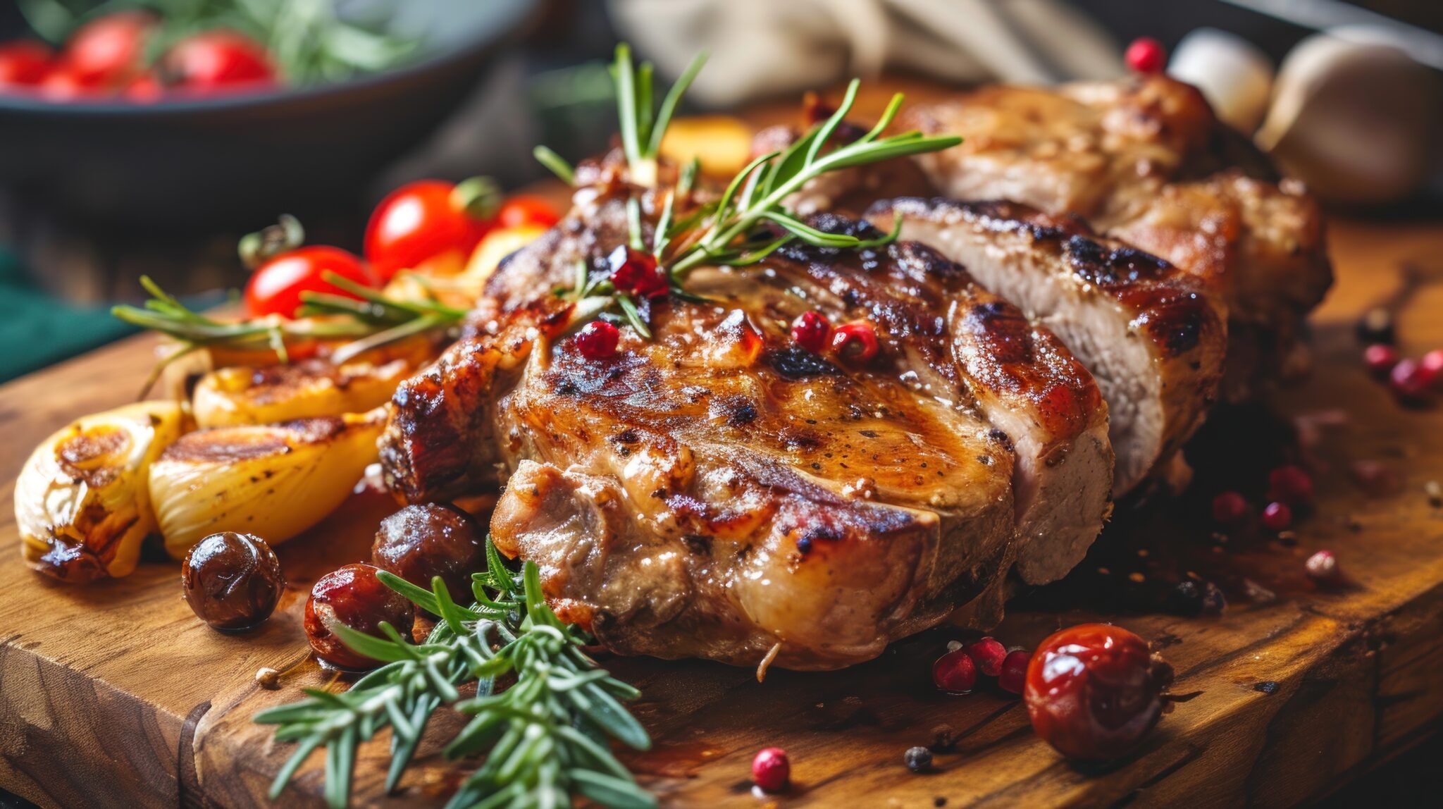 2 pork chops, 2 tbsp olive oil, 2 minced garlic cloves, 2 tbsp Worcestershire sauce, 1 tbsp Dijon mustard, 1 tbsp brown sugar, 2 tsp Montreal steak seasoning, 1 tsp salt.