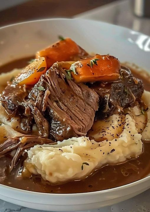 Serve the pot roast over a bed of mashed potatoes, spooning some of the gravy and vegetables from the pot over the top.