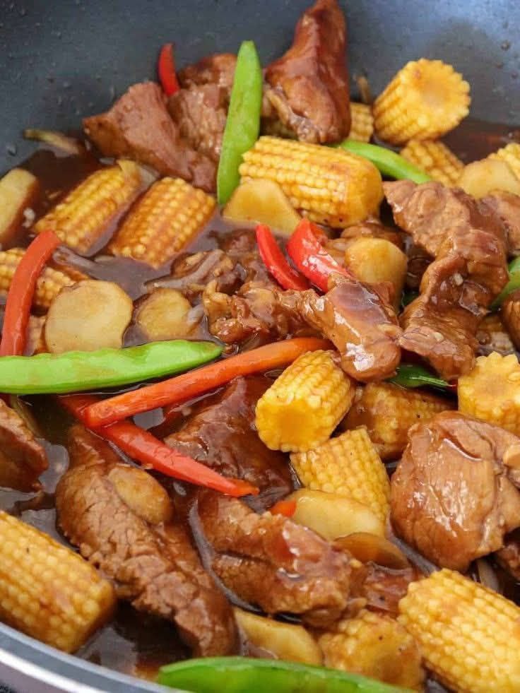 - Toss in baby corn, bell peppers, and water chestnuts. Stir-fry for another 2 minutes.