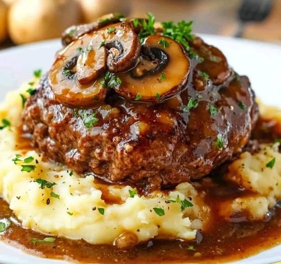 Serve the Salisbury steaks with a generous helping of garlic mashed potatoes and top with the mushroom and onion gravy.