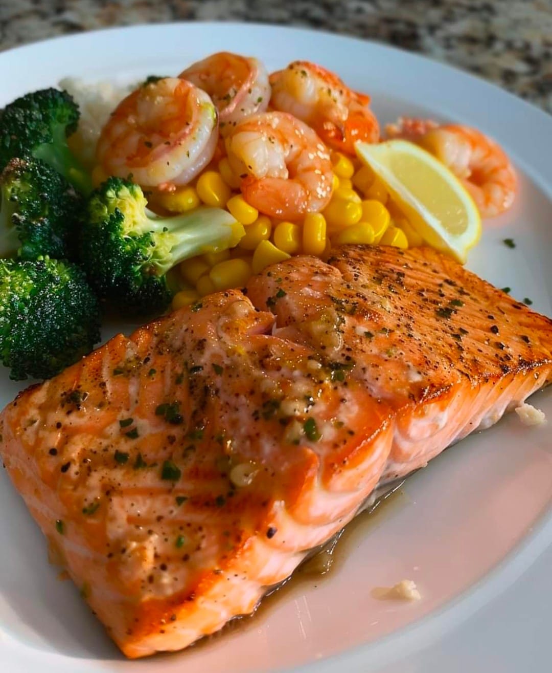 Salmon, Shrimp, Cheesy Broccoli with Corn