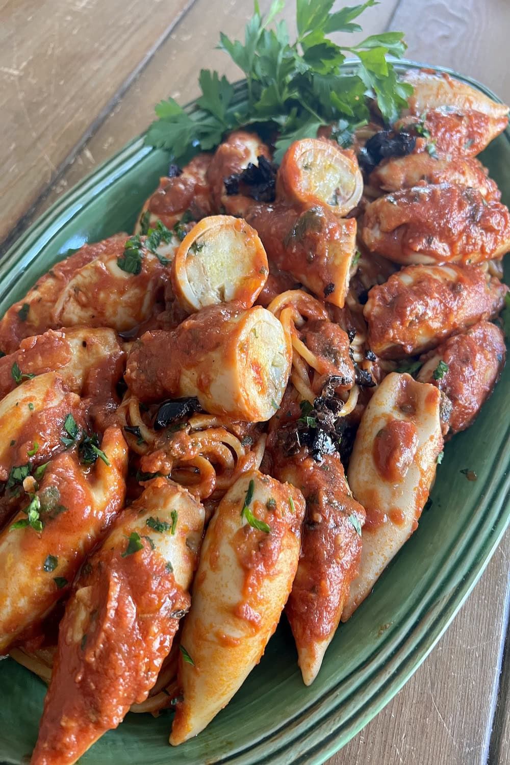 Tender squid tubes are filled with a savory mixture of breadcrumbs, chopped tentacles, garlic, herbs, cheese, and sometimes seafood like shrimp or crab. They’re then simmered gently in a rich tomato sauce until perfectly tender.