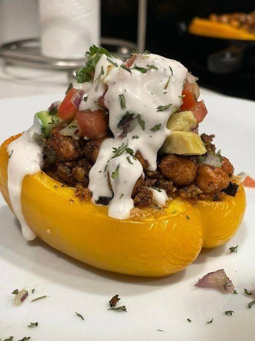 (Stuffed with Quinoa, Walnut/Mushroom “Meat”, Chickpeas, Topped with Avocado, Tomatoes, Cilantro, Red Onion and a Vegan Caesar Dressing)
