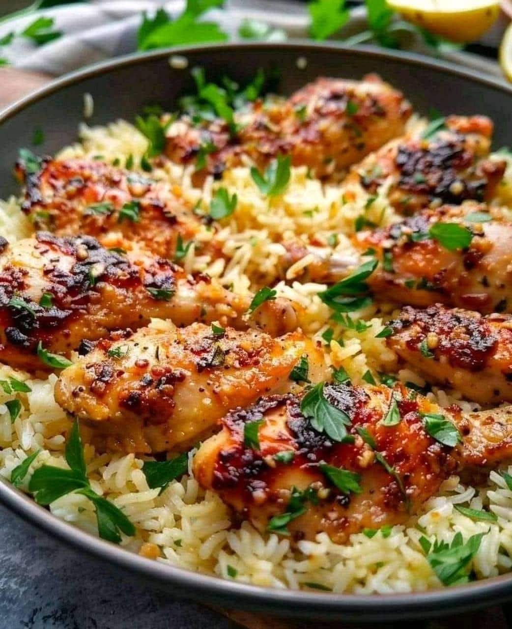 Sprinkle Parmesan cheese over rice. Place the chicken pieces on top of the rice and drizzle with the reserved sauce. Cover, remove from heat and cook for 5 minutes. Garnish with more Parmesan cheese and fresh parsley if desired.