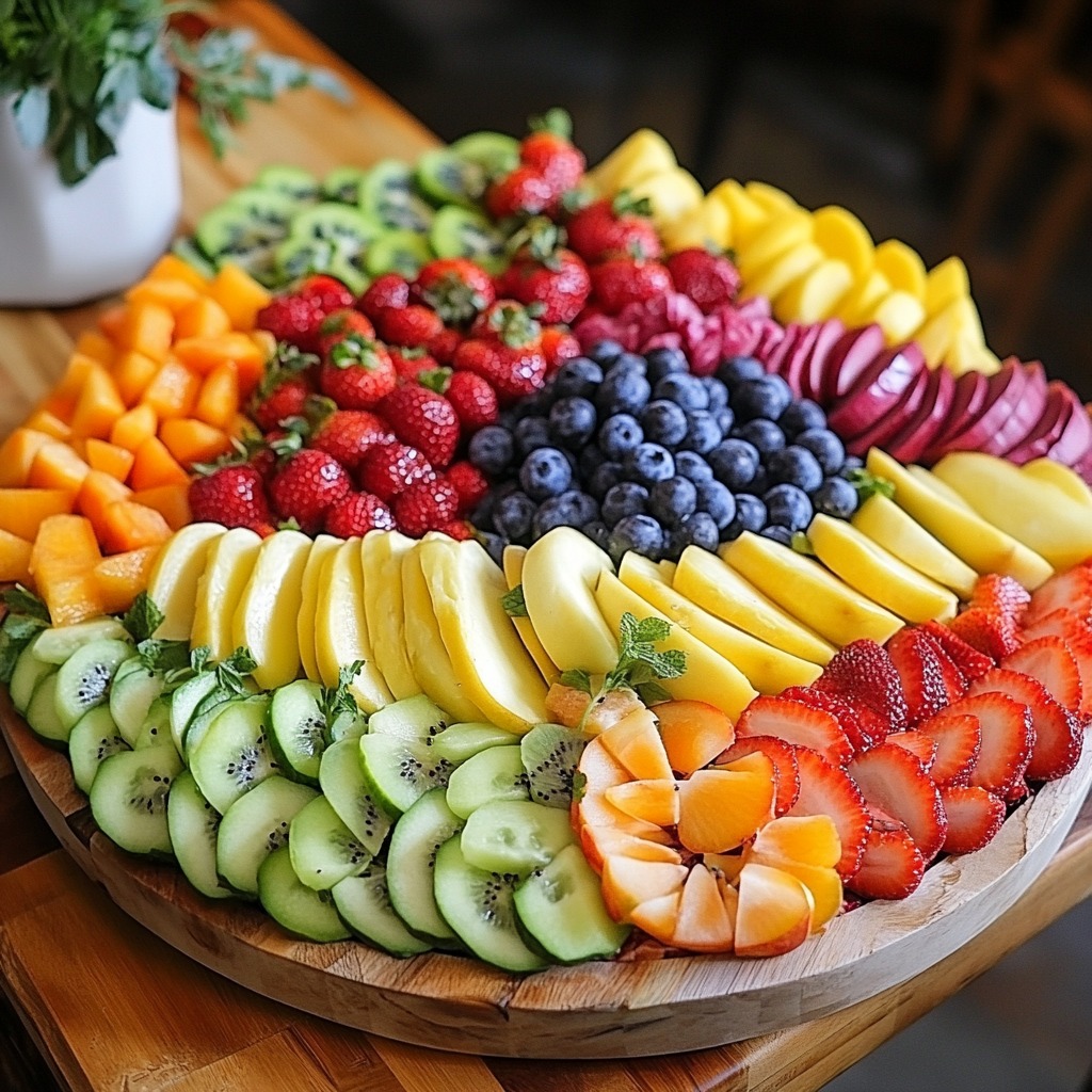 5. Arrange the fruit mixture on a large serving platter or board, creating a colorful wave pattern.