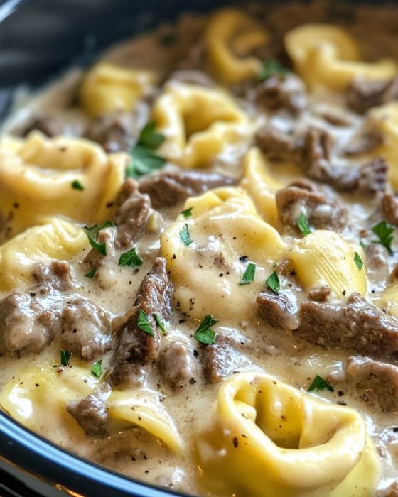 Creamy Provolone Sauce Over Slow Cooked Cheesesteak Tortellini